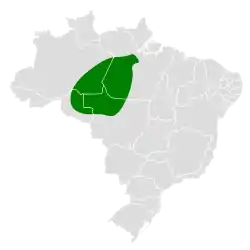 Se distribuye en el centro de la Amazonia, en Brasil, al sur del río Amazonas, desde el río Madeira al este hasta el río Xingu, al sur hasta Rondônia y el norte de Mato Grosso.[3]