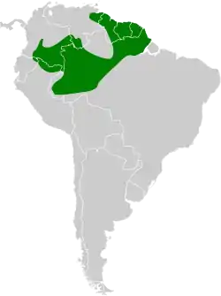 Las diversas subespecies se distribuyen por el sureste de Colombia, hacia el este por el sur y este de Venezuela, Guyana, Surinam y Guayana francesa, hacia el sur por el noreste de Ecuador, extremo noreste de Perú y por gran parte de la Amazonia brasileña.[6][7][8]