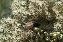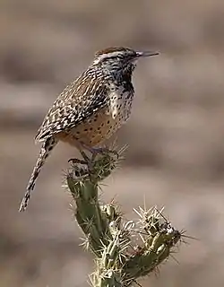 ![]() Ejemplar de cucarachero desértico (Campylorhynchus brunneicapillus) en las afueras de Phoenix, Arizona. | ||