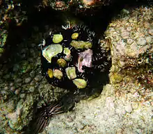 De manera similar, los erizos de mar usan sus pies de tubo para recoger los desechos del fondo y ponerlos en su superficie. Usan caparazones, piedras, algas y a veces anémonas de mar.[16]