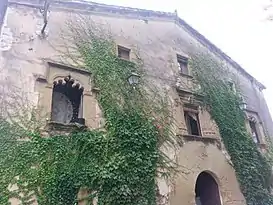 La fachada principal consta, en la planta baja, de un gran portal adovelado en forma de arco de medio punto, de dos ventanas pequeñas y de un banco corrido a ambos lados del acceso principal. En la dovela clave de la portada principal hay un relieve enmarcado con las abreviaturas de JESÚS y MARÍA. El primer piso tiene dos ventanas góticas a ambos lados de la ventana central, de estructura renacentista. Las ventanas góticas tienen arcadas conopiales, dinteles formados por dos bloques y montantes y antepechos moldurados. La ventana principal y central, formada por un gran dintel monolítico, está ricamente decorada. Hay tres niveles de molduras, un escudo nobiliario con tres gusanos sostenido por dos personajes infantiles desnudos, dos hombres de medio cuerpo con escudos a ambos lados del antepecho moldurado, jambas con columnas simuladas y tracerías y ligaduras decorativas, capiteles a nivel de las impostas con forma de cabezas humanas (masculino, femenino e infantiles en los diferentes niveles de moldura) y jefes haciendo sonar cuernos o trompetas en los extremos superiores. El segundo piso tiene tres ventanas pequeñas de piedra, la central de las cuales es mayor. La mayoría de las ventanas tienen los soportes en forma de tres bloques que dejan entrever una pequeña aspillera.[1]