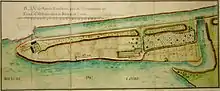 un canal... para comenzar por debajo de la calzada del estanque de Loizelet,[lower-alpha 1] a la entrada de dicho bosque [de Orleans] y enseguida desciende al estanque de Joudrie, pueblo de Vieilles-Maisons [sur-Joudry] y al estanque de Grignon, y desde allí, pasando por varios lugares y parroquias cae en el río de Loing por debajo de Sepoix [Cepoy], cerca de Montargis.[Pi. 4]