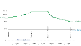El gráfico siguiente muestra el perfil del canal de Orleans desde Orleans, con una línea de costa en el Loira a la derecha de la desembocadura del Combleux de aproximadamente 95 m, hasta la desembocadura en Buges, cruza con el canal du Loing, situado a una elevación de la línea de costa de 83 m. El alcance es el punto más alto del canal (124 m) con una diferencia de nivel de 95 m del lado del Loira y 41 m del lado del Sena.[Pi. 1]