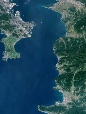 La ciudad de Uraga está situada en el extremo norte del canal en la península de Miura. Debido a su ubicación estratégica en la entrada de la bahía de Edo, Uraga ha sido a menudo el primer punto de contacto entre los buques extranjeros que visitaban la bahía y Japón.