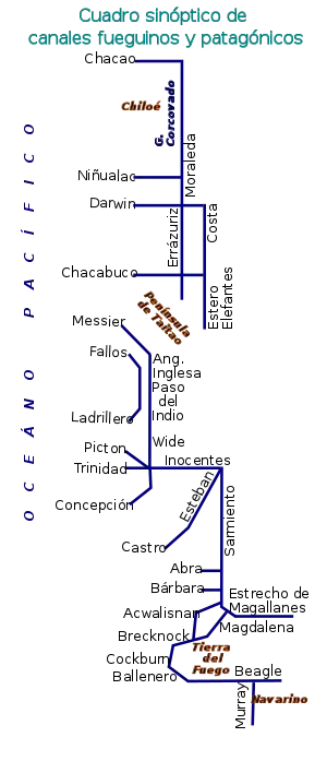 Entre la isla Grande de Tierra del Fuego y los archipiélagos del sur y sureste, se interpone el extenso canal Beagle con un recorrido total de casi 200 millas; de occidente a oriente va tomando sucesivamente diversos nombres : canal Brecknock, canal Ballenero, canal O'Brien, seno Darwin, brazo del Noroeste y brazo del Sudoeste y canal Beagle propiamente dicho. [2]