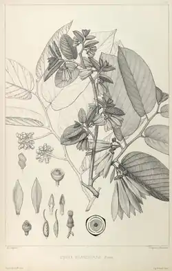 ![]() Ilustración botánica de Cananga brandisiana (identificada con su basiónimo Unona brandisiana) | ||