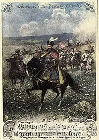 - Esta obra contiene una traducción derivada de «Cossack songs» de Wikipedia en inglés, publicada por sus editores bajo la Licencia de documentación libre de GNU y la Licencia Creative Commons Atribución-CompartirIgual 3.0 Unported.