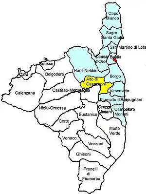 En aplicación del Decreto nº 2014-255[2] de 26 de febrero de 2014, el cantón de Alto-di-Casaconi fue suprimido el 22 de marzo de 2015 y sus 13 comunas pasaron a formar parte del nuevo cantón de Golo-Morosaglia.