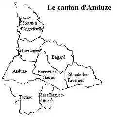 En aplicación del Decreto nº 2014-232[2] de 24 de febrero de 2014, el cantón de Anduze fue suprimido el 22 de marzo de 2015 y sus 8 comunas pasaron a formar parte; cinco del nuevo cantón de Alès-1, dos del nuevo cantón de Quissac y una del nuevo cantón de La Grand-Combe.