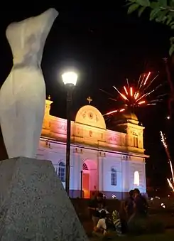![]() Escultura "Cacique Barvak" del escultor Fabio Brenes, mirando la Parroquia San Bartolomé Apóstol, vistos desde el Parque Central de Barva.