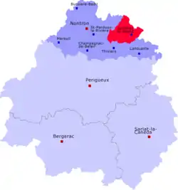 En aplicación del Decreto n.º 2014-218[2] de 21 de febrero de 2014, el cantón de Jumilhac-le-Grand fue suprimido el 22 de marzo de 2015 y sus 7 comunas pasaron a formar parte del nuevo cantón de Thiviers.