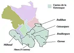 En aplicación del Decreto n.º 2014-232[2] de 24 de febrero de 2014, el cantón de La Vistrenque fue suprimido el 22 de marzo de 2015 y sus 6 comunas pasaron a formar parte; cuatro del nuevo cantón de Marguerittes, una del nuevo cantón de Saint-Gilles y la fracción de la comuna de Nimes se unió con las demás para que, por medio de una reestructuración cantonal, fueran creados los nuevos cantones de Nimes-1, Nimes-2, Nimes-3 y Nimes-4. .