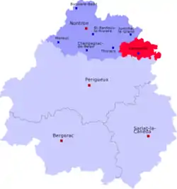 En aplicación del Decreto n.º 2014-218[2] de 21 de febrero de 2014, el cantón de Lanouaille fue suprimido el 22 de marzo de 2015 y sus 10 comunas pasaron a formar parte; nueve del nuevo cantón de Isle-Loue-Auvézère y una del nuevo cantón de Thiviers.