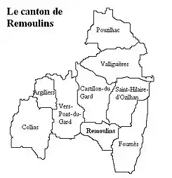 En aplicación del Decreto nº 2014-232[2] de 24 de febrero de 2014, el cantón de Remoulins fue suprimido el 22 de marzo de 2015 y sus 9 comunas pasaron a formar parte del nuevo cantón de Redessan.