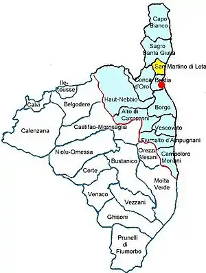 En aplicación del Decreto nº 2014-255[2] de 26 de febrero de 2014, el cantón de San-Martino-di-Lota fue suprimido el 22 de marzo de 2015 y sus 3 comunas pasaron a formar parte, uno del nuevo cantón de Bastia-1 y dos del nuevo cantón de Cabo Córcega.
