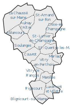 En aplicación del Decreto nº 2014-208[2] de 21 de febrero de 2014, el cantón de Vitry-le-François-Este fue suprimido el 22 de marzo de 2015 y sus 16 comunas pasaron a formar parte; nueve del nuevo cantón de Vitry-le-François-Champaña y Der y siete del nuevo cantón de Sermaize-les-Bains.