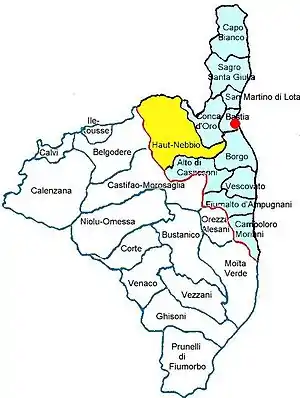 En aplicación del decreto nº 2014-255[2] de 26 de febrero de 2014, el cantón del Alto Nebbio fue suprimido el 1 de abril de 2015 y sus 10 comunas pasaron a formar parte, siete del nuevo cantón de Biguglia-Nebbio, dos del nuevo cantón de L'Île-Rousse y una del nuevo cantón de Golo-Morosaglia.
