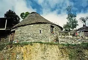En la parte baja de la palloza vivía el ganado y en la parte superior, un fuego bajo, también llamado "Lareira" y un pequeño dormitorio conjunto.[2]