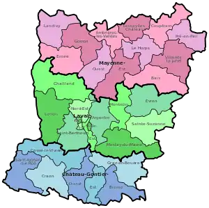- Distrito de Château-Gontier[1](7 cantones - subprefectura: Château-Gontier):