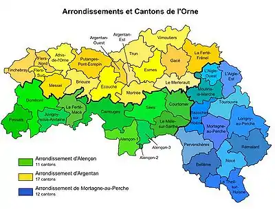 - Distrito de Mortagne-au-Perche[3](12 cantones - subprefectura: Mortagne-au-Perche):