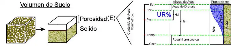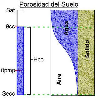 Dinámica del contenido del agua en el suelo, especificando los puntos de Saturación (Sat), Capacidad de Campo (CC), Humedad del Suelo (Pw), Punto de Marchitez Permanente (PMP) y Seco. Además las alturas de agua derivadas de los contenidos, Agua de Drenaje, Humedad aprovechable (Ha), Humedad disponible o de déficit (Hd) y Agua Higroscópica. La Capacidad de Campo es el contenido de agua o humedad que es capaz de retener el suelo luego de saturación o de haber sido mojado abundantemente y después dejado drenar libremente.