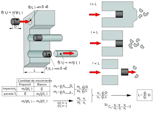 Si tenemos un blanco con un espesor menor que la capacidad de penetración el proyectil perderá parte de su velocidad por transferencia de cantidad de movimiento pero continuara aunque a menor velocidad. Si es espesor fuera justo la capacidad de penetración el proyectil se pararía justo antes de salir. Si el espesor es mayor el proyectil llegaría igualmente a hasta la capacidad de penetración. Hay que notar que según este modelo aunque se detenga el proyectil la parte del blanco desprendida tiene la misma cantidad de movimiento. En la realidad se producen deformaciones, desprendimiento de astillas, etc.