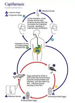 La infección en humanos se produce al comer pescado crudo o poco cocido infectado por Capillaria philippinensis. Las primeras descripciones se realizaron en Filipinas en el año 1963, tras producirse un brote epidémico que afectó a mil personas y provocó más de cien fallecimientos. [3]