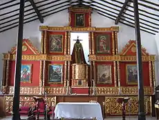 El testero cuenta con un antiguo retablo de estilo barroco y que parece haber pertenecido a otro templo; consta el retablo de cornisas, columnas, tímpanos, altares, tabernáculo, expositorio, nichos y camarín. Las cornisas están adornadas con arabescos; las columnas son adosadas, de fuste trenzado o de lazo con capiteles corintios y jónicos; los tímpanos adornados con rosetones y arabescos; los altares laterales tienen frontal de madera tallada, con decoración fitaria (adorno de forma vegetal) serpeante, con sendos monogramas y coronas de espinas; el tabernáculo y el expositorio son tallas bien realizadas. Los nichos están comprendidos entre las cornisas, las columnas y cenefas y están situados en ellos seis cuadros, dos de los cuales son de gran valor artístico, los otros cuatro, de recientemente adquiridos, poseen marcos al estilo florentino con representaciones o imágenes de la Virgen María. El nicho principal corresponde a un vano en el centro del retablo y tiene su respectivo camarín y allí está ubicada la imagen que es la de Jesús Nazareno.