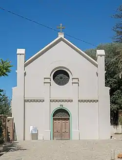 Construida a base de ladrillos, vigas de roble y piedra caliza, presenta una nave central con 18 columnas y arcos de medio punto, y con un gran mural en su techo, realizado por el artista italiano Pablo Gennai.[1][2][3][4]