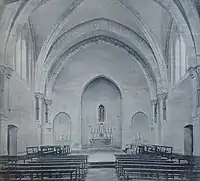 En la década de 1970, tras la adquisición de Notre Dame por parte de la Santa Sede, todo el conjunto fue objeto de una ambiciosa restauración.[5] Por lo que se refiere a la capilla, la capilla de esta (el coro y lo que hay debajo de él) se separa de la misma para permitir el paso de un ala del albergue a la otra sin entrar en la capilla misma. El pasillo resultante en la parte inferior forma el atrio de la capilla actual, y en él se instala la pila bautismal.