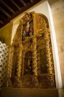 El retablo, cuya realización fue concertada con los hermanos Sánchez de Rueda en el año 1717, consta de banco, cuerpo y ático de medio punto, y el banco, por mediación de cuatro basamentos sirve de apoyo a los soportes del cuerpo principal. Está articulado a partir de columnas salomónicas, y se adorna con pinturas de la Ascensión y la Epifanía, de escasa calidad, ejecutadas por Pedro Ruiz Morián, y habiendo sido concertada su realización en 1723. La calle central del retablo, cuya anchura es el doble de las calles laterales, está ocupada por una imagen de San Ambrosio del siglo XVII. En el ático del retablo está situado un Calvario de talla correspondiente a finales del siglo XVI.