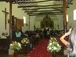 Las gradas del presbítero y la balaustrada son curvadas al estilo barroco. En la portada de ladrillo el arco de ingreso es de medio punto y flanqueado por pilastras. La espadaña de tres cuerpos está edificada completamente en ladrillo; en el segundo cuerpo las campanas están en dos vanos de medio punto de estilo tradicional almohade. El remate es un frontispicio triangular relativamente agudo con dos búcaros, originalmente coronado por un aditamento cerámico (ausente en nuestros días).
