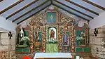 Respecto al interior, este es de una única nave con planta rectangular y cubierta con vigas a la vista, destacando el bajo techo de la entrada, sobre el cual se halla la tribuna, a la que se accede mediante una escalera situada a la derecha. La capilla mayor, también de planta rectangular, se encuentra emplazada tras un sencillo arco de medio punto y posee un retablo barroco con policromía principalmente granate, mostrando tonalidades verdes para las tablas y los frisos y doradas para los relieves ornamentales. La estructura se compone de un cuerpo con cinco calles, destacando cuatro pilares salomónicos decorados con racimos de uvas y un ático triangular con aletones decorados con rocalla y coronado por una forma arquitectónicamente similar a un frontón partido curvo, detalle que se repite en las calles de los extremos. El retablo está presidido por una talla de Santa Catalina (acompañada de sus atributos: la cruz, la rueda y la palma) la cual se elaboró para reemplazar a la original hallada en la costa.[1][2] A izquierda y derecha se ubican imágenes de San Roque y San José respectivamente, mientras que en los extremos destacan a la derecha una talla de San Antonio de Padua y a la izquierda una imagen de vestir de mayor tamaño de Nuestra Señora de los Dolores, todas ellas situadas frente a superficies planas y siendo la talla de Santa Catalina la única que cuenta con una hornacina, cuyo fondo está compuesto por un vidrio texturizado en vez de por una tabla de madera o un cristal liso, como suele ser habitual.