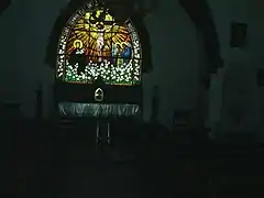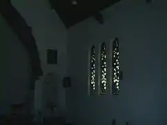 Jose Santiago Berna construyó dos relieves con vitraux que muestran azucenas a los lados del altar.