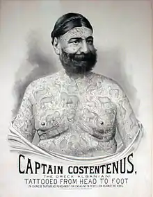 Vistos como exóticas rarezas, hombres y mujeres tatuados se exhibieron en los espectáculos de fenómenos desde mediados del siglo XIX a mediados del XX, justificando su aspecto siempre con historias de expediciones o viajes a regiones remotas y salvajes donde habrían sido capturados por indígenas y tatuados como castigo. Así, Constentenus reclamó ser descendiente de un noble griego de la provincia del imperio otomano de Albania. En 1867 viajaba con un estadounidense y un español por Tartaria en una expedición minera. Una rebelión surgió y ellos se unieron a los insurgentes. Fueron tomados prisioneros y sometidos a una larga sesión de tres meses de tatuajes como castigo. Después de completado el proceso, los tres huyeron de la prisión. El estadounidense sobrevivió solo unos meses. El español quedó ciego y murió en Manila. El tatuaje estaba hecho en azul y rojo con índigo y cinabrio, y le cubría por completo. Las únicas excepciones eran las palmas de las manos, las plantas de los pies y las orejas. Tenía un total de 387 figuras tatuadas en el cuerpo. Las imágenes iban desde animales exóticos y flores a figuras geométricas y escritura extranjera. Era conocido por ser capaz de hablar múltiples lenguas.[1]