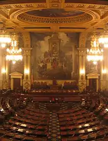 La Corte Suprema de Pensilvania es la corte de último recurso en el Commonwealth. El Tribunal Superior de Pensilvania es uno de los dos tribunales de apelación intermedios del estado. La Sala de la Corte Suprema, oficialmente la Sala de la Corte Suprema y Superior, es utilizada por ambos tribunales y fue diseñada utilizando temas de la antigua Grecia y Roma.[Ma. 3] Está ubicado en el cuarto piso del capitolio, en el lado este de la rotonda. La Sala de la Corte Suprema es la más pequeña de las tres cámaras con 13 por 22 m.[El. 11]