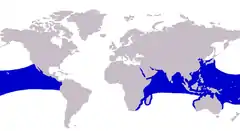 Se encuentra en las costas de los océanos Índico y Pacífico: desde el Mar Rojo y el África Oriental hasta Hawái, sur del Japón, Australia y Nueva Caledonia. También desde el suroeste de la Baja California y el Golfo de México hasta Ecuador, incluyendo las Islas Galápagos.