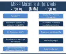 Si el peso máximo autorizado (MMA) de la caravana no supera los 750 kilos, no es necesario matricularla (tiene que llevar la misma matrícula del coche para poder circular), pero si supera los 750 kilos se debe matricular (matrícula roja); en este caso la caravana debe llevar dos matrículas: la del coche y la propia. En este caso, tiene que pasar la Inspección Técnica de Vehículos (la primera a los 6 años y luego cada 2). Las caravanas de este peso, menor a los 750 kilogramos, son llamadas mini caravanas[3].