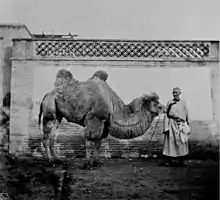 Las caravanas procedentes de ambos extremos de la ruta Hohhot-Gucheng estaban compuestas por camellos bactrianos de dos jorobas, adecuados para el clima de la zona, aunque muy ocasionalmente se podían ver dromedarios de una sola joroba llevados a esta ruta por los uigures ( "Turki", en El lenguaje de Lattimore) gente de la caravana de Hami [7] Normalmente, una caravana estaría compuesta por una serie de archivos ( Chinese, lian ), de hasta 18 camellos cada uno. Cada uno de los caravaneros de base, conocidos como los tiradores de camellos (Chinese, la luotuo-de ), estaba a cargo de uno de estos archivos. En la marcha, el trabajo del camellero consistía en conducir el primer camello de su limón con una cuerda atada a una clavija pegada al hocico, conduciendo cada uno de los otros camellos del limón por medio de una cuerda parecida por el camello de enfrente. de esto. Dos limones ( lian ) formaban un ba, y los tiradores de camellos de las dos limas se ayudaban mutuamente a la hora de cargar carga en los camellos al inicio de la marcha de cada día o de descargarla cuando se detenían . Para realizar su trabajo correctamente, los tiradores de camellos debían ser expertos en camellos: como comenta Lattimore, "como no se conoce ningún buen doctorado para él [un camello] cuando está enfermo, deben aprender a mantenerlo bien". Cuidar la salud de los camellos incluía la posibilidad de encontrar el mejor pastoreo disponible para ellos y mantenerlos alejados de las plantas venenosas; conocimiento de cuándo no debe permitirse que un camello beba demasiada agua; cómo aparcar los camellos durante la noche, que les permita obtener el mejor refugio posible de la nieve soplada por el viento en invierno; cómo distribuir correctamente la carga para evitar que haga daño al animal; y cómo tratar las heridas leves de los camellos, como ampollas o úlceras. [8]