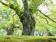 El roble, árbol base de este entorno es un árbol robusto, de porte majestuoso, que puede superar los 40 metros de altura. Está clasificada en la Sección Quercus, que son los robles blancos de Europa, Asia y América del Norte. Tienen los estilos cortos; las bellotas maduran en 6 meses y tienen un sabor dulce y ligeramente amargo. Las hojas carecen de una mayoría de cerdas en sus lóbulos, que suelen ser redondeados. Tiene flores masculinas en amentos colgantes, verdes-amarillentos, que nacen solitarios o en grupos de ramillas del año anterior. Bellotas colgantes sobre un largo pedúnculo, aovado-oblongas, con caperuza o cascabillo de escamas casi planas, empizarradas.