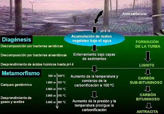 Durante la diagénesis ocurren procesos de descomposición de la materia orgánica debido al ataque de las bacterias aeróbicas, lo que sucede cuando los restos vegetales están cubiertos parcialmente por agua o a poca profundidad donde aún hay oxígeno para que puedan existir estas bacterias. Durante esta etapa se produce una reducción de volumen de hasta un 50%. Una vez que las bacterias consumen todo el oxígeno esta etapa finaliza y comienza la descomposición de la materia orgánica restante por las bacterias anaeróbicas. En esta etapa continua la descomposición de la materia orgánica produciéndose ácidos húmicos, los cuales van acidificando el medio hasta llegar a un pH 4 en el cual mueren las bacterias anaeróbicas.[cita requerida] De esta forma se forma la turba sobre la cual se van depositando más restos vegetales que a su vez forman más turba, lo que hace que la temperatura de las capas inferiores vaya aumentando comenzando las transformaciones por metamorfismo cuando la temperatura alcanza los 100 °C. Con el transcurso de miles de años, más acumulaciones de turba y sedimentos van enterrando cada vez más el carbón mineral que se está formando. Debido al aumento de la temperatura y la presión el carbón mineral va evolucionando desde el lignito hasta la antracita, liberándose gases, sustancias volátiles y aceites, y enriqueciéndose cada vez más en carbono el carbón mineral formado.[cita requerida]