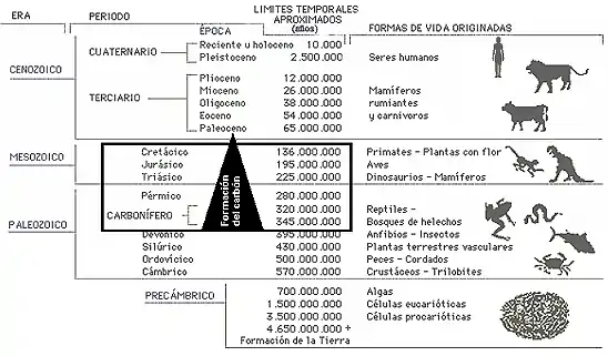 La gran mayoría de los depósitos de carbón mineral se formaron durante el período geológico del Carbonífero. Otros depósitos importantes se formaron durante el Pérmico. Existen también depósitos, menos abundantes pero significantes, formados durante el Triásico y el Jurásico y en menor cantidad en el Cretácico.