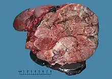 ![]() Micrografía de un carcinoma adrenocortical (a la izquierda de la imagen, azul oscuro) y de la corteza adrenal de la que surgió (arriba a la derecha de la imagen, rosa / azul claro). La médula suprarrenal benigna está presente (mitad derecha de la imagen, gris/azul). Tinción H&E. | ||