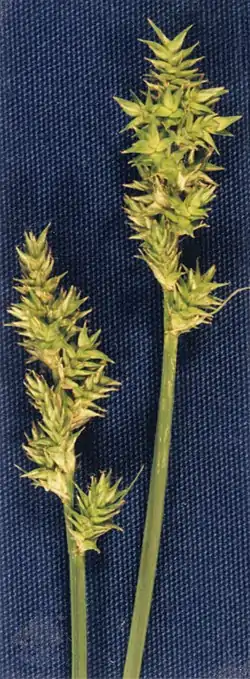 Esta especie produce densos racimos de tallos erguidos que alcanzan hasta unos 80 centímetros de altura máxima. Las hojas son de color verde pálido a grisáceo, planas, y de color rojizo o salpicada de púrpura las vainas en la base. La inflorescencia es un denso y oblongo grupo de 15 espigas de flores, cada grupo de hasta 3 o 4 centímetros de largo y cada uno de los picos de hasta un centímetro de longitud. El fruto está envuelto en un saco llamado perigynium que es de color verdoso y nervaduras de color rojizo con una punta.