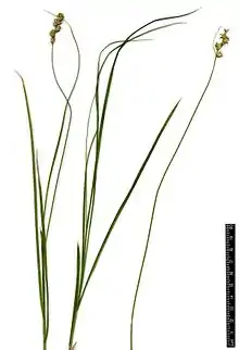 Es una planta con rizoma de entrenudos muy largos, con tallos que alcanzan un tamaño de 20- 60(100) cm de altura. Las hojas de 1-2,5 mm de anchura, de mayor longitud que los tallos, planas, ásperas en los bordes y nervio medio del envés, blandas; lígula de con los bordes levantados, de anchura mayor o menor que el limbo, de ápice obtuso o redondeado. Espigas dispuestas en espiga simple de 1-3,5(5,4) cm, agrupadas, a veces con la espiga inferior separada del resto, en cuyo caso la inflorescencia puede alcanzar hasta 5,8 cm. Glumas ovales, agudas, de color verde pálido o pajizo, las femeninas generalmente mayores que los utrículos. Aquenios 1,2-1,7 × 0,7-1 mm, de contorno ± elíptico, biconvexos, con la base del estilo persistente en forma de una corta columna. Tiene un número de cromosomas de 2n = 58*.[1]