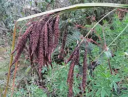 Cespitosa, sin rizomas reptantes. Tallos de 60 a 100 cm de longitud, delgados; vainas basales sin láminas, rojizas, fibrosas. Hojas de 45 a 75 cm largo por 2,5 a 7 mm de ancho, verdea, glaucas, carinadas. Inflorescencia en espigas, las superiores sésiles y suberectas, las inferiores péndulas en pedúnculos cortos o largos, delgados, ramificados; bráctea tan o más larga que la inflorescencia, foliiforme, no envainante.[2]