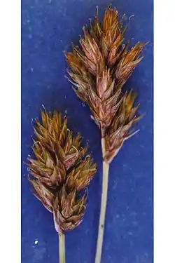 Produce densos racimos de tallos de hasta unos 90 centímetros de altura máxima y hojas estrechas, hasta de unos 30 centímetros de largo. La inflorescencia es un denso cúmulo abierto de espigas de color de oro, café, rojizo. El fruto está cubierto con un saco llamado perigynium que, generalmente, es de color verdoso o marrón cobrizo, nervado, y con alas.