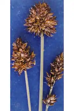 Esta juncia produce tallos de hasta unos 60 centímetros de altura y las inflorescencias que son densas y alargadas con indistinguibles grupos de espigas de flores.