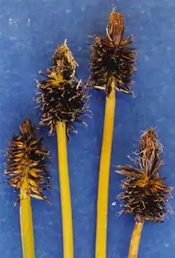 Es juncia produce gruesas alfombras y suelta grupos de tallos de hasta 30 centímetros de altura desde una red de cortos rizomas. Las flores masculinas tienen oscuras brácteas y el fruto está cubierto de pico largo de perigynium de un color oscuro.