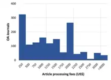 Diferentes editoriales académicas tienen niveles de tarifas muy variables, que van desde menos de US$ 100 hasta más de US$ 3000.[1] [11][12] Los editores tradicionales a veces cobran tarifas altas para publicar en una revista híbrida de acceso abierto, lo que hace que un artículo individual en una revista de suscripción tenga acceso abierto. Se calcula que el APC promedio para las revistas híbridas es casi el doble que los APC de editores de acceso abierto completo.[13] Las revistas con factores de impacto alto de las principales editoriales tienden a tener los APC más altos.